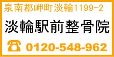 院名 淡輪駅前整骨院 住所 〒599-0301大阪府泉南郡岬町淡輪1199-2 営業時間 平日
